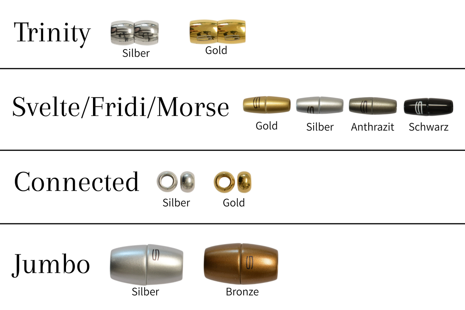 Ja! Für die Schmuckstücke aus der Serie Trinity kannst du zwischen Gold und Silber wählen. Bei den Schließen der Serien Svelte, Fridi, Morse und Cocoon kannst du zwischen Silber, Gold, Anthrazit und Schwarz wählen. Für die Connected Armbänder hast du die Wahl zwischen einer versilberten oder vergoldeten Konnektor-Perle. Für die Colliers der Serie Jumbo gibt es die Schließen in Silber und Bronze.
