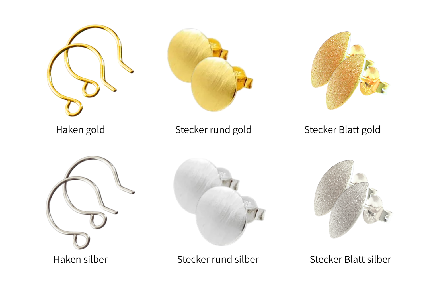 Wir bieten Ohrhaken, -stecker und Clips in versilberter oder vergoldeter Variante an. (Ausnahmen sind die Svelte Ohrstecker und Svelte Ohrclips!)