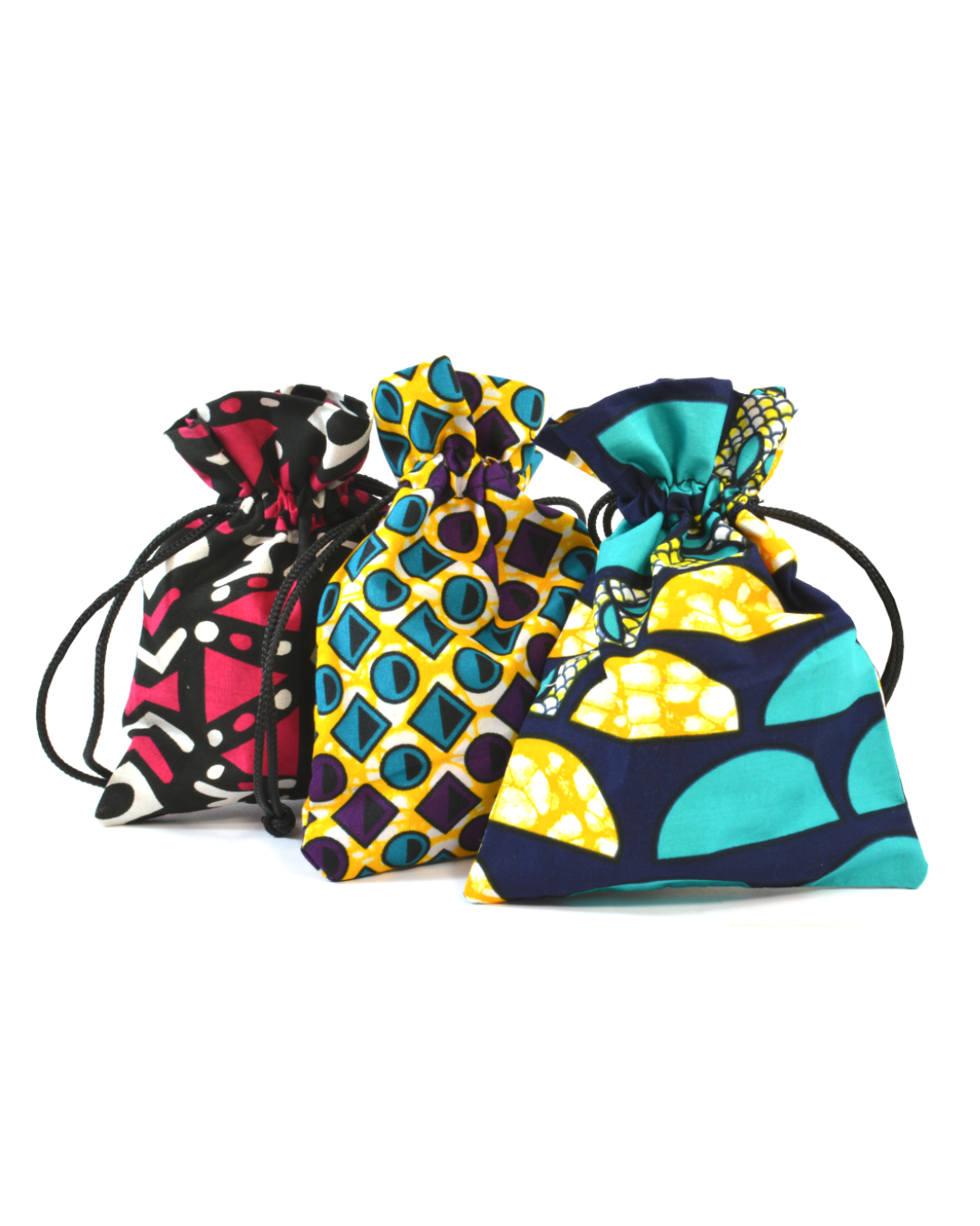 Diese schlichten Baumwollsäckchen werden in Togo gefertigt – aus farbenfrohen afrikanischen Stoffen. Mit ihrem Kordelzug sind sie vielseitig einsetzbar: als Schmuckverpackung, Geschenkbeutel oder kleines Aufbewahrungssäckchen.